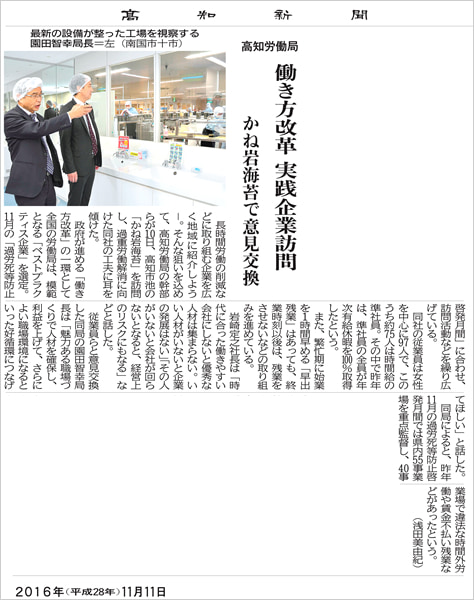 平成28年11月11日付の高知新聞に当社の働き方改革についての記事が掲載されました。